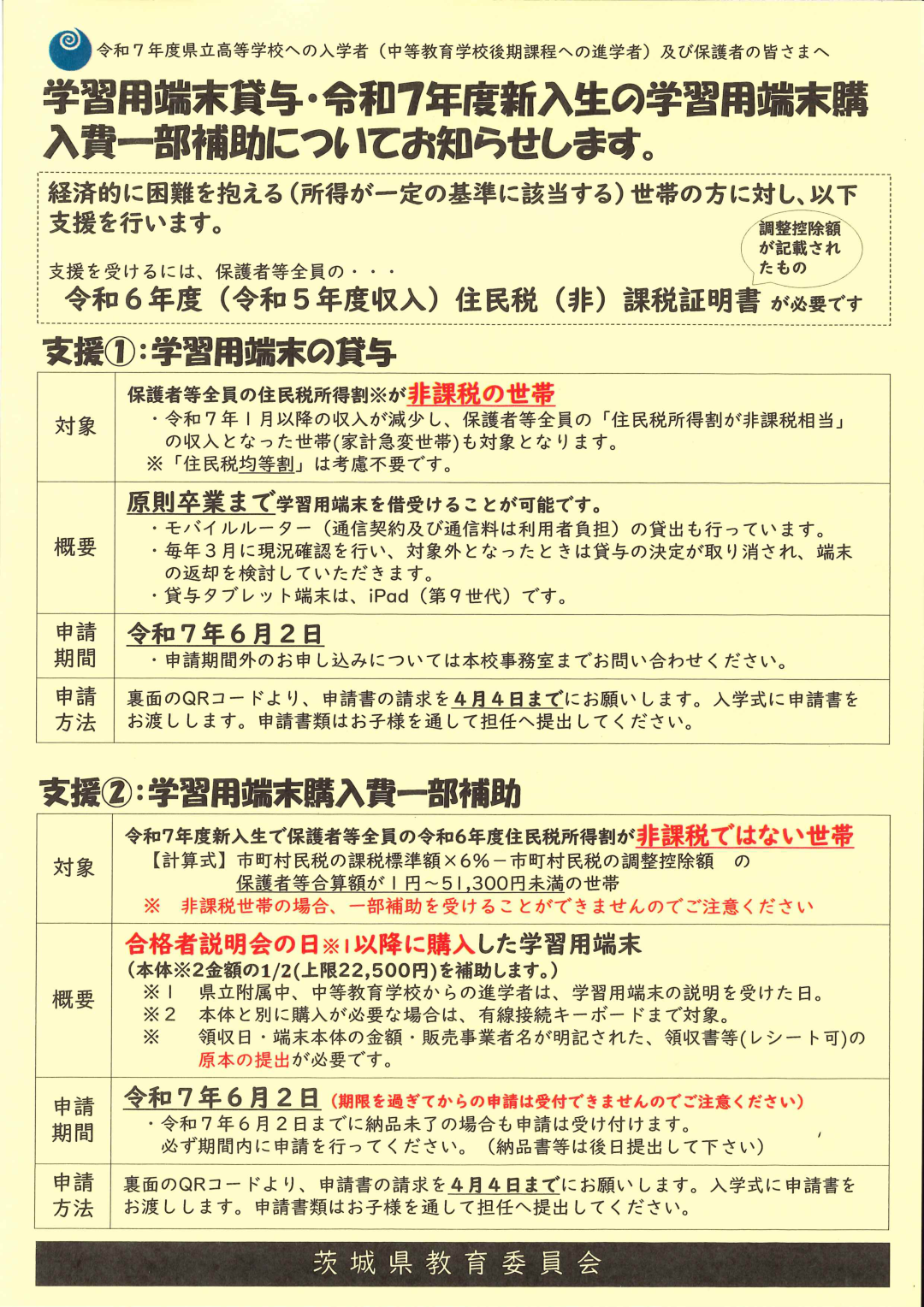 経済的に困難を抱える家庭に対する支援を行います。住民税非課税世帯には端末の貸与を,住民税非課税世帯に準ずる世帯には端末購入費の一部補助 (入学年の4月1日以降に購入したことが分かる領収書が必要) を行います。詳しくは別紙をご覧ください。