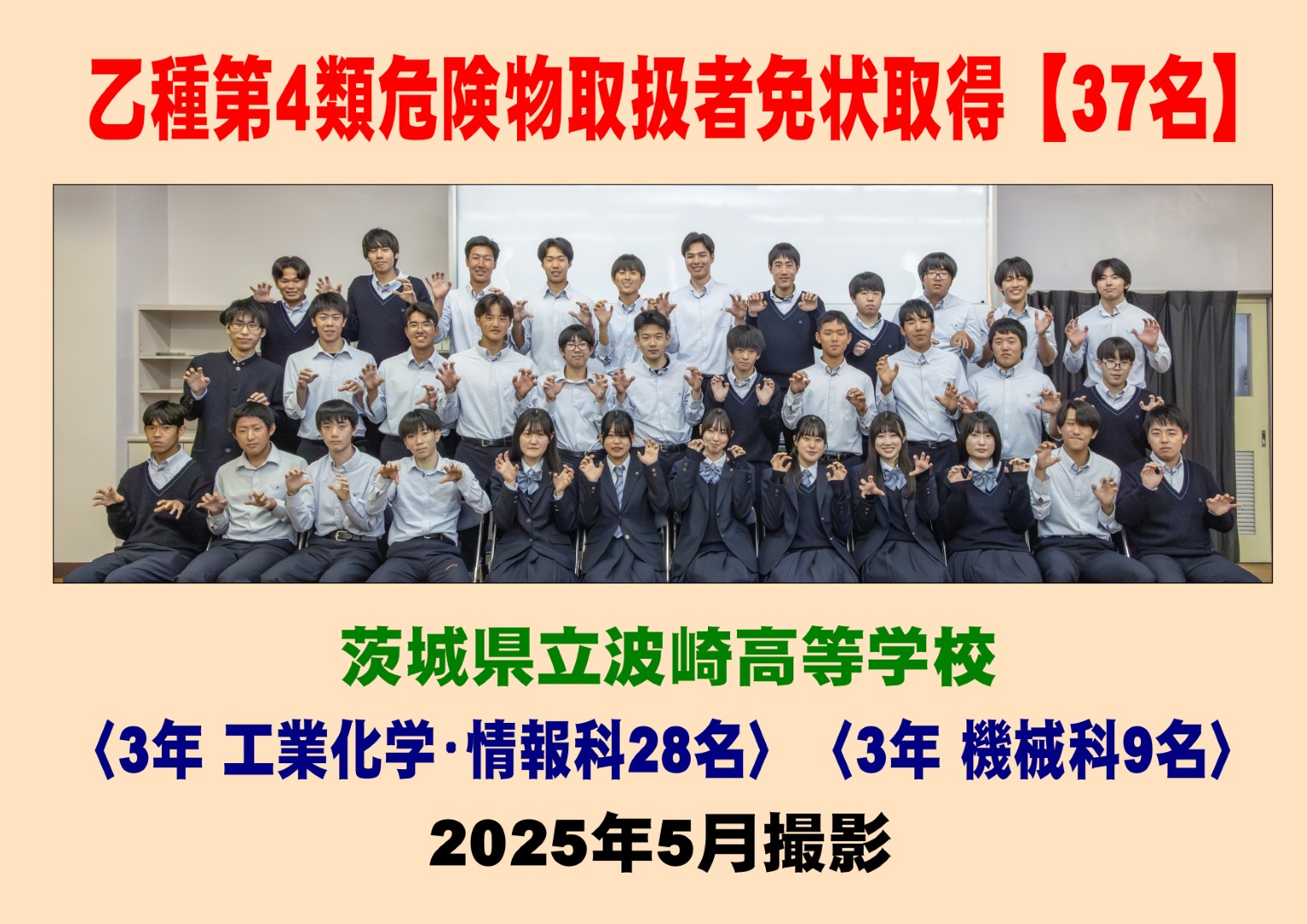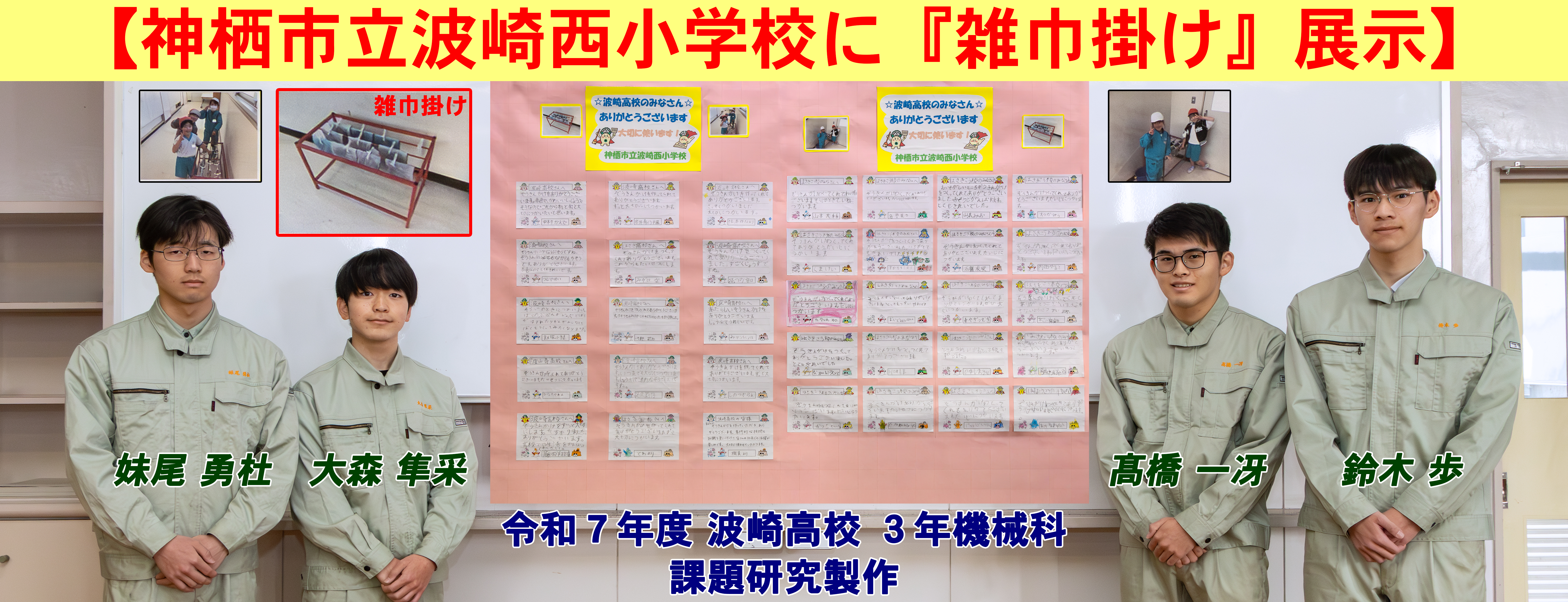 特徴的な授業紹介 課題研究 課題研究は3年次全員が履修する授業です。生徒が主体となって身近な課題を発見し,これまでに学んだ知識や技術を生かしながらその課題を解決するものです。令和7年度は課題研究で雑巾掛けを製作し波崎西小へ展示しました。