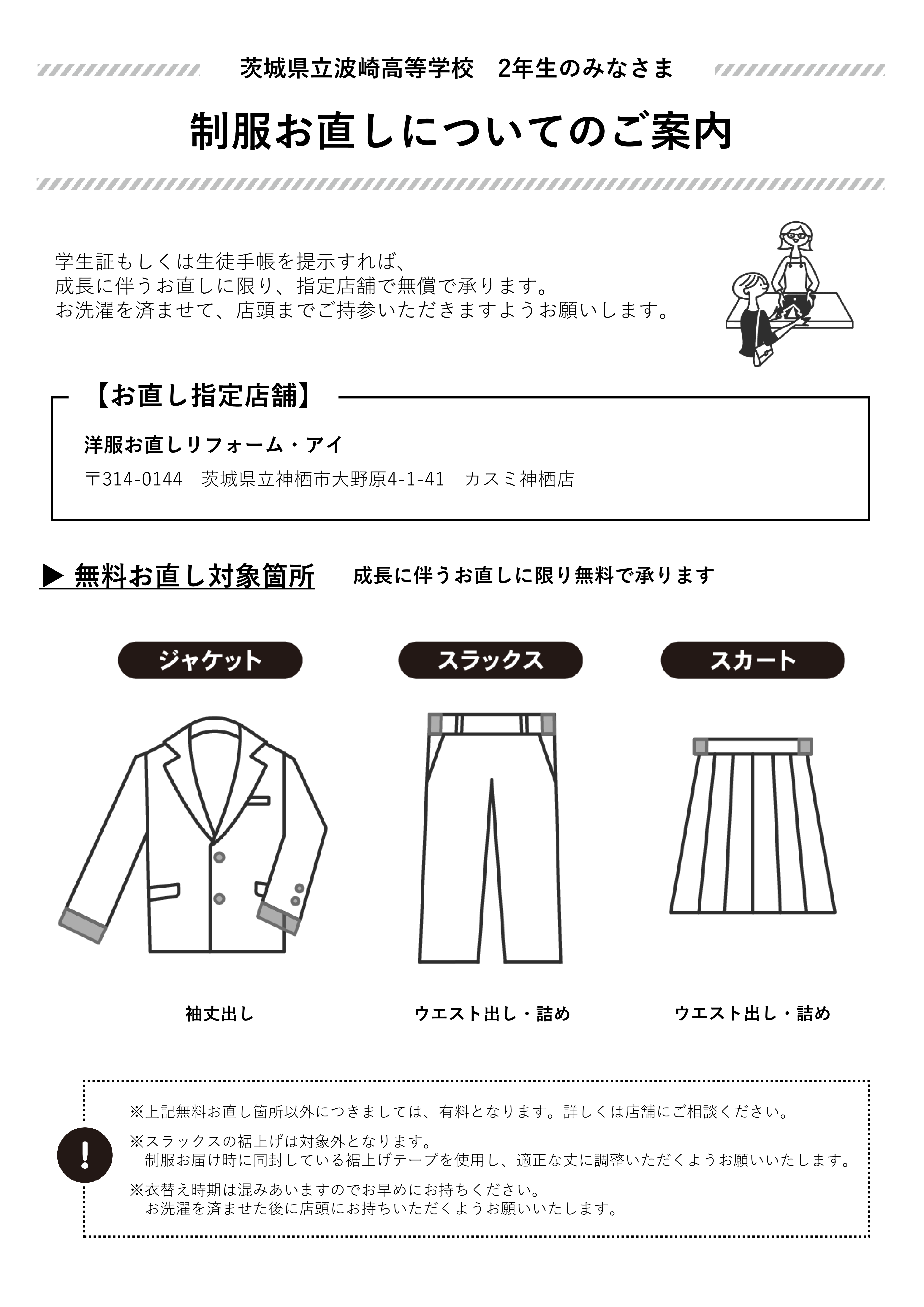 制服お直しとWEB販売 制服のお直し、およびWEB販売についてはチラシをご覧ください。入学年度によって案内が異なるのでご注意ください。 令和7年度入学生向け (新2年生) 制服 令和7年度入学生向け案内 (PDF / 978 KB) 令和6年度入学生向け (新3年生) 制服 令和6年度入学生向け案内 (PDF / 957 KB)